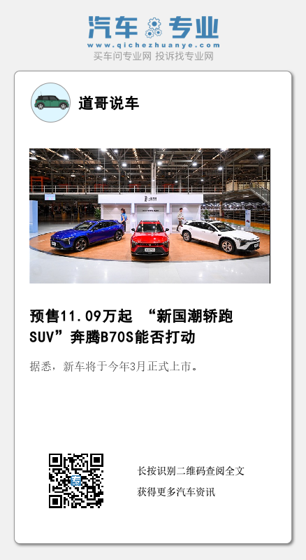 而作为一汽奔腾全新品牌战略下首款战略车型,奔腾B70S的到来不仅填补了奔腾的产品矩阵,而且对提升奔腾品牌年轻化形象有着积极作用。同时,各方面表现都比较突出的奔腾B70S,也满足了年轻消费者对于一款轿跑SUV的所有需求,让他们有了全新的选择。相信,其正式上市后还将给我们带来更多惊喜。