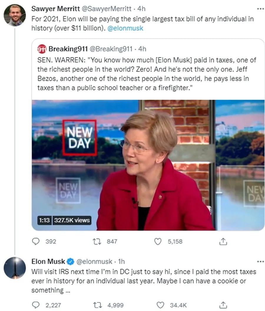 日前,特斯拉投资人Sawyer Merritt在推特上转发了一段美国民主党参议员伊丽莎白·沃伦(Elizabeth Warren)的抨击特斯拉CEO马斯克去年根本没有纳税的采访,并配文表示,马斯克在2021年缴税超110亿美元,是历史上纳税额最高的个人。
