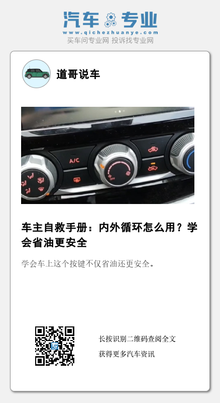 第一堵车时我们一定要关闭外循环防止尾气进入车内。第二车辆暴晒或长时间不开,打开外循环释放车内的甲醛等有害气体。第三夏天开空调,开A/C打开内循环防止冷气排出,冬天开空调关A/C打开外循环,更省油也不容易起雾。你学会了吗?