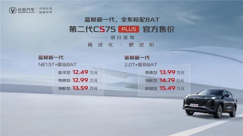 作为不断进化的明日座驾,第二代CS75PLUS延续上一代车型高价值的基础上实现了进一步的升华。其不仅越级全系标配了爱信8AT、全系贯穿式流光LED前位灯、全系12.3英寸双联屏、全系巨幕全景天窗、全系540°高清全景影像和全系6安全气囊等高价值配置外,还在设计、科技、安全、动力等方面实现了全面进阶。同时,从价格上来看,因为取消了1.5T自动挡精英车型,新车1.5T豪华型的售价与2022款CS75PLUS1.5T自动豪华型12.49万的价格相同,2.0T最顶配售价也与现款持平,可谓加量不加价、诚意满满。