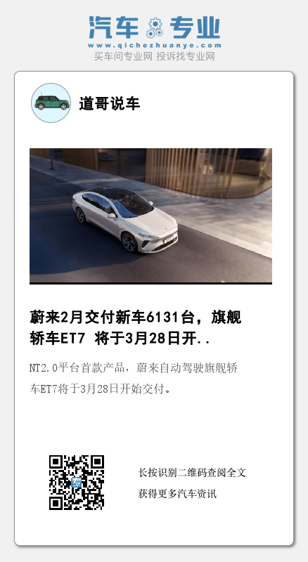 3月1日,道哥说车从蔚来汽车官方获悉,2022年2月蔚来共交付智能电动汽车6,131台,同比增长9.9%。截至2022年2月底,蔚来累计交付182,853台智能电动汽车。蔚来2021年第四季度财报将于3月25日公布。NT2.0平台首款产品,蔚来自动驾驶旗舰轿车ET7将于3月28日开始交付。