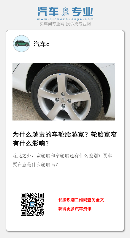 一般十万以下的车用的都是窄且小的轮胎,175、185、195,轮胎直径14、15的居多。越高级的车排量越大的车用的都是宽且大的轮胎,比如225、235、245的轮胎居多。大部分车的高配车型和低配车型也存在这轮胎宽度的差异,低配用的轮胎更窄更小一些。一辆车用的轮胎宽窄一定是受成本所限,价格便宜的车不会用太宽的胎,因为宽轮胎成本高。除此之外,宽轮胎和窄轮胎还有什么差别?买车要在意是什么轮胎吗?