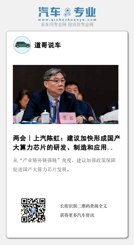 《道哥说车》获悉,本届两会上,全国人大代表、上汽集团党委书记、董事长陈虹聚焦“助力落实双碳战略目标”,提出《关于完善相关政策体系支持汽车产业绿色低碳高质量发展的建议》,以及《关于加强产业链布局和基础设施建设推动新能源汽车可持续发展的建议》;瞄准“智能网联汽车发展”,提出《关于修订完善相关法律法规和配套政策支持智能网联汽车加快发展的建议》;着眼“产业链补链强链”,提出《关于推进车规级、大算力芯片国产化支持国内汽车芯片产业链协同发展的建议》。