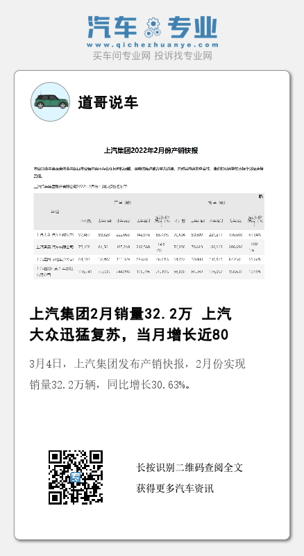 《道哥说车》消息,3月3日,上汽集团发布产销快报,2月份实现销量32.2万辆,同比增长30.63%,今年以来已连续2个月同比正增长;1-2月累计销量77.8万辆,同比增长19.7%。从各个分公司的销售情况看,上汽大众、自主品牌、新能源、海外市场均延续不俗表现,上汽通用则表现稍差成为合资品牌中唯一同比下滑的品牌。