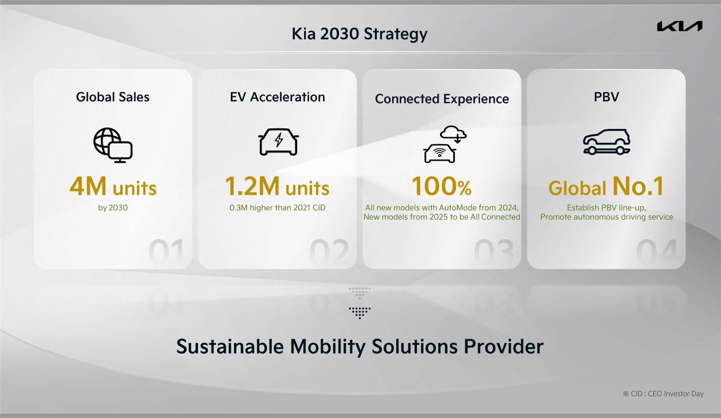 【2022年3月3日,首尔】在2022年CEO投资者开放日上,起亚正式发布2030战略规划,致力于成为可持续移动出行领域的全球领导品牌。