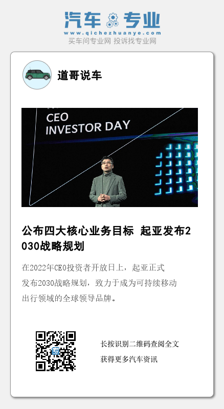 起亚还公布了2030年四大核心业务目标,包括:加快推进电动化,2030年纯电动汽车年销量达到120万辆;2030年全球汽车产品销量达400万辆,其中环保车型超200万辆;所有新车均配备智能互联系统和自动驾驶辅助技术; 2030年成为全球PBV(个性化定制车型)市场第一品牌。