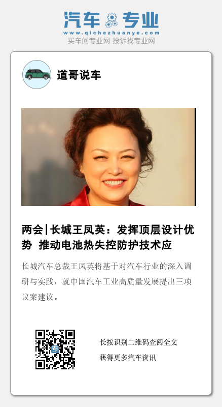 《道哥说车》获悉,本届两会上,作为第十一届、第十二届、第十三届全国人大代表、长城汽车总裁王凤英将基于对汽车行业的深入调研与实践,就中国汽车工业高质量发展提出三项议案建议,分别为:《关于推动中国汽车工业产能利用率提升的建议》、《关于推动动力电池热失控防护技术应用的建议》、《关于推动中国车规级芯片产业快速发展的建议》。