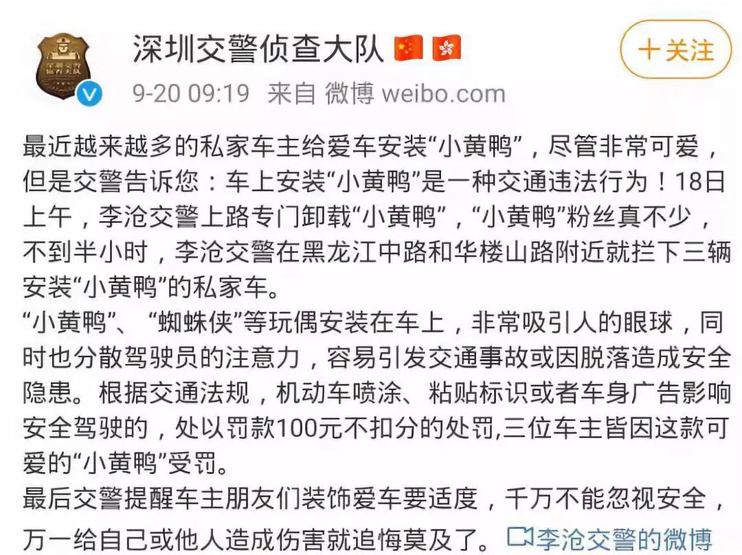 车载小黄鸭有点像之前走红的外挂“蜘蛛侠”。虽然这样的装饰确实有点可爱,但除了存在安全隐患之外,更值得注意的是还涉嫌违法。