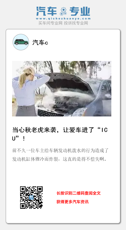 虽然天气入秋转凉,但是蹦出个秋老虎也是让人猝不及防,当然还有和你一起出门的汽车,尤其是发动机,温度非常高,偶发故障的时候遇到脑子烧坏的主人,干上一些坑爹的行为,不但没有给汽车降温,还能分分钟把汽车搞残。前不久一位车主给车辆发动机泼水的行为造成了发动机缸体骤冷而炸裂,这真的是得不偿失啊。
