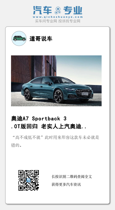 而此前停售的3.0T版奥迪A7 Sportback车型在售价上并未与现款上汽奥迪A7L拉开太过离谱的距离,当年的奥迪A7 Sportback售价区间为80.88-87.98万元,如果意愿购买满配上汽奥迪A7L(77.77万)的消费者未必不会因为溜背造型以及进口属性带来的优势而选择重回中国市场的奥迪A7 Sportback。