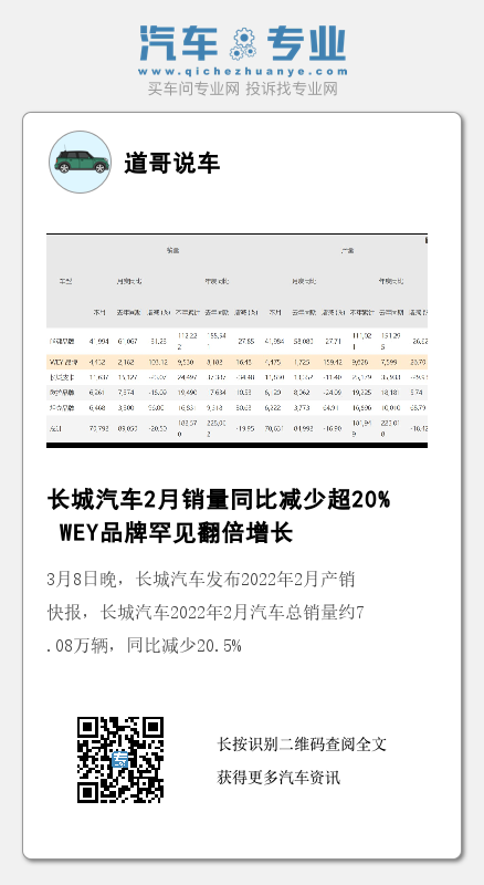 《道哥说车》消息,3月8日晚,长城汽车发布2022年2月产销快报,长城汽车2022年2月汽车总销量约7.08万辆,同比减少20.5%;今年累计销量约18万辆,同比减少19.95%。