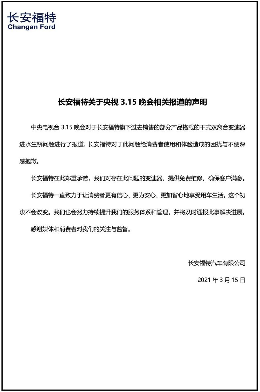 次日,福特和英菲尼迪再发声明。福特表示,将对干式双离合进水生锈问题的保修期延长至“10年或24万公里”,并且针对在长安福特授权的经销商自费维修过干式双离合变速箱生锈问题的消费者,退还相关费用;英菲尼迪也表示,将进口QX60变速箱的保修期延长至“8年或20万公里”(自新车购买之日起,以先到者为准)。同时,如车主在上述延长保修期内在品牌授权经销商处自费维修或更换变速箱,经核实无误后退还相关费用。