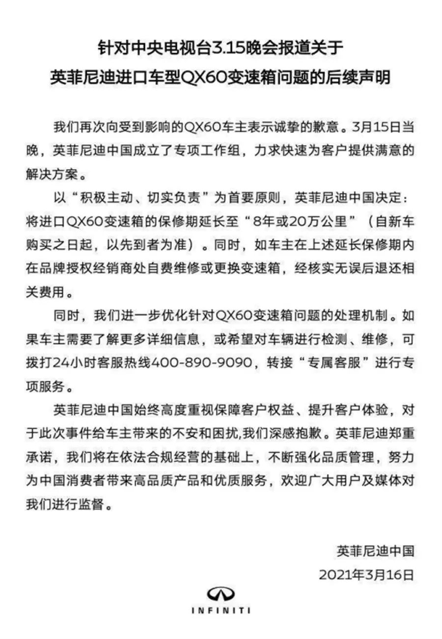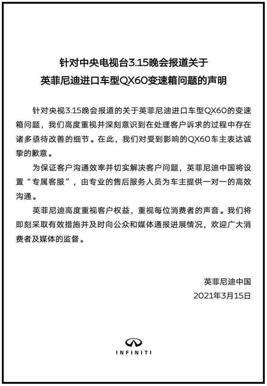 315之后,福特和英菲尼迪立刻发布声明道歉,福特表示会提供免费维修;英菲尼迪则表示会为车主提供一对一沟通。
