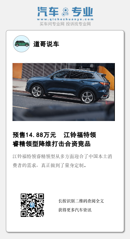 江铃福特领睿精领型从多方面迎合了中国本土消费者的需求,真正做到了量身定制。特别是在定价方面,相信会让不少车友心动。江铃福特领睿精领型将与铂领型、尊领型、尊领型PLUS一起,共同完成江铃福特领睿家族对细分市场的全面覆盖。