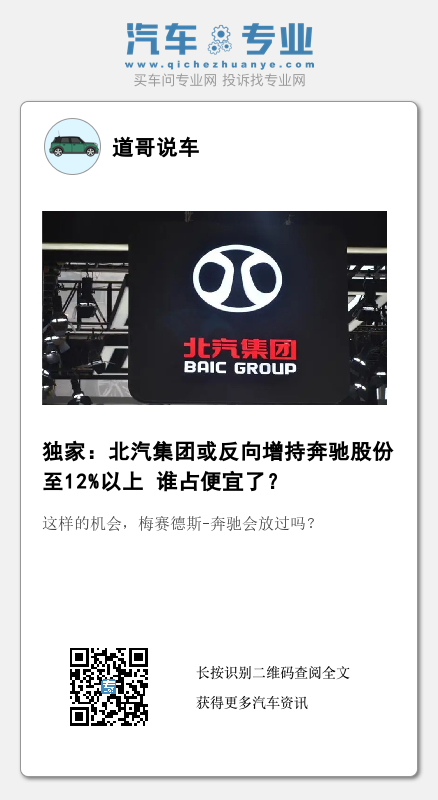 值得一提的事,该人士提到,在去年北汽集团增持梅赛德斯-奔驰股份至9.98%、超过吉利成为第一大股东后,北汽集团还有意增持梅赛德斯-奔驰股份到12%以上,此举意在对冲外方增持北京奔驰所造成的收益减少,目前增持举措也得到了奔驰方的支持。
