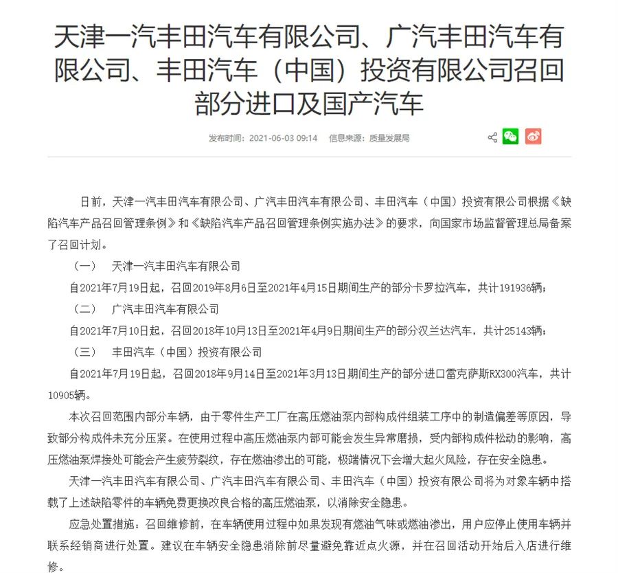 除了质量投诉的日益增多,去年的6月和7月,一汽丰田卡罗拉先后两次因质量问题发起召回。一次因车辆高压燃油泵部分构成件未充分压紧,在使用过程中高压燃油泵内部可能会发生异常磨损,高压燃油泵焊接处可能会产生疲劳裂纹,存在燃油渗出的可能,召回旗下故障卡罗拉车辆,数量高达19.19万辆。