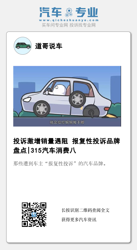 【文/道哥说车 跃跃】今年的315没有一家车企上榜,不知道是各品牌都表现的滴水不漏还是今年的热点颇多无法顾及汽车领域。事实上,《道哥说车》编辑发现,临近315这个时间点的时候,有不少品牌的车主都在积极投诉添柴加火,希望自己的车型能够上315晚会。下面,《道哥说车》编辑将为大家梳理那些遭到车主“报复性投诉”的汽车品牌。