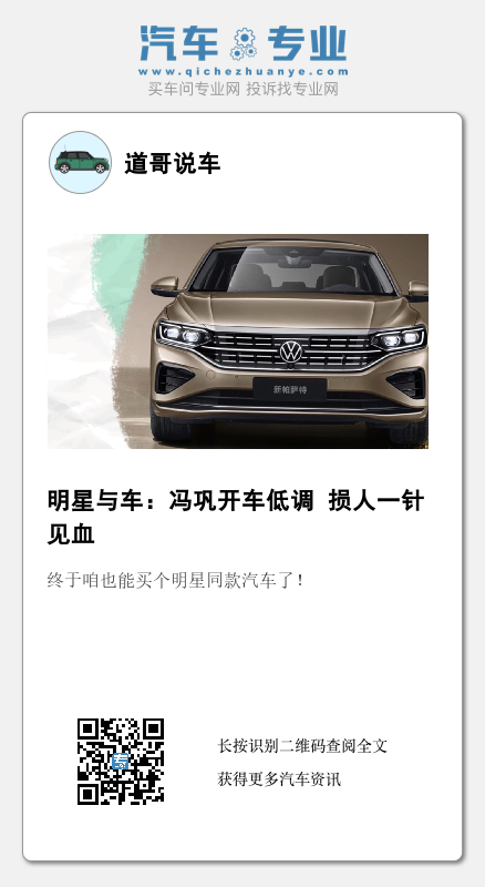 别看咱冯巩老师损人如此犀利,他平时可是一个超级低调的人。他的座驾是一辆帕萨特,没错你没听错二十多万就能买顶配的帕萨特。帕萨特从空间到使用上都挑不出什么毛病,是一款很省心的家用车。另外在舒适度上帕萨特也算同级别的优等生,前后排除了有舒适的坐姿之外,这台长测车的配置也绝对跟得上,前排座椅记忆、加热、通风和按摩都有,性价比还是很高的!终于咱也能买个明星同款汽车了!