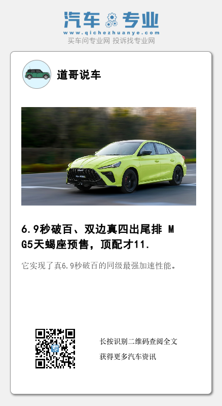 从产品来看,MG5天蝎座与现款MG5相比最大的变化莫过于运动属性,而这一运动属性并不仅仅停留在外观设计上,包括配置、动力系统都有显著的提升,甚至这款车能将百公里加速做到6.9S,对于燃油车尤其是10几万元的燃油车,这一数据意味着什么,无需多说。
