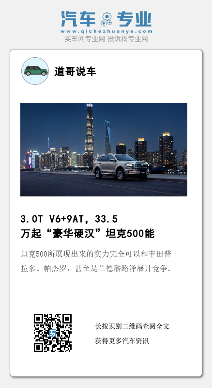 作为一款中大型豪华SUV,坦克500将它该有的硬汉气质以及奢华范儿,展现的可谓是淋漓尽致。