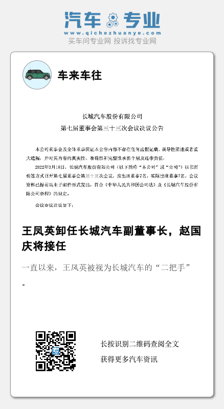 3月19日,长城汽车发布公告显示,王凤英女士将不再担任公司执行董事及副董事长职务,执行董事、副总经理赵国庆先生将接任。
