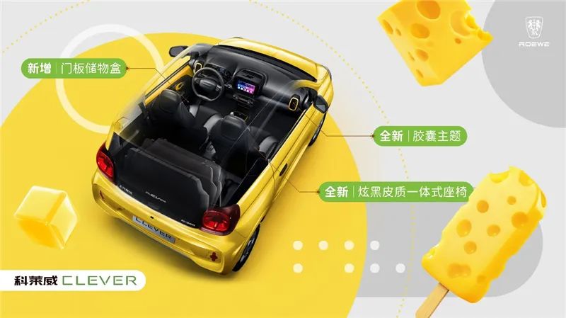 外观上,新车在萌趣满分的3140mm灵巧车身上,新增情感饱和度MAX的“黄芝芝”车色,与清爽Q弹的“白椰椰”车色组成缤纷风尚双子星,令人怦然心动、过目难忘。全新回旋镖铝合金轮毂造型独特,超凡脱俗彰显个性,让活力无限的科莱威CLEVER萌酷加倍。