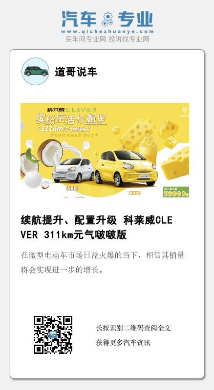 作为备受年轻消费者青睐的“超长待机小钢炮”,此次升级而来的科莱威CLEVER 311km元气啵啵版,在延续过去优秀品质的基础上,在外观、内饰、续航和科技方面均有所升级,价格也相比现款(4.49-4.89万元)有所提升。