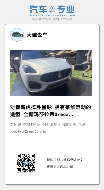 全新玛莎拉蒂Grecale(图片)发布,是玛莎拉蒂入门级的SUV设计,不过在外观上依旧展现了豪华的风格,车内也是具有豪华的气质,长宽高分别为4846mm*2163mm(含后视镜)*1670mm,轴距为2901mm,在动力上提供2.0T发动机,匹配48V微混系统,分高低功率版本,还搭载3.0T V6发动机可供选择,以及还有纯电动版本的车型,均匹配8速手自一体变速箱。市场竞品上则是对标保时捷Macan,路虎揽胜星脉,还有雷克萨斯RX等车型。
