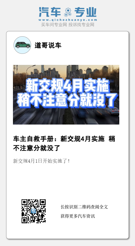 新交规4月1日开始实施了!赶紧来重新学习一下,不然稍不留神分就不保了。特别是最后一条,一旦出错直接扣完12分。动手点点小关注,顺便发给你有车的朋友,消除马路杀手从你我做起。