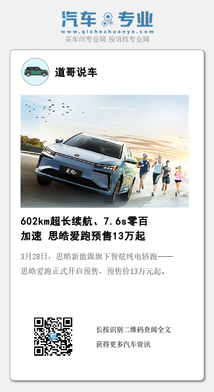 3月28日,思皓新能源旗下智炫纯电轿跑——思皓爱跑正式开启预售,预售价13万元起,并携手知名运动平台Keep发起“爱跑,就要一直跑”思皓新能源线上跑挑战赛,呼吁人们在疫情期间坚持运动,保持积极的心态,调节身心健康。
