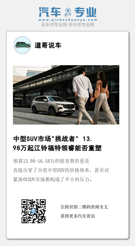 和一众老牌合资中型SUV相比,无论是出色的颜值、领先的智能科技、宽敞的空间以及传承自百年福特的动力总成,江铃福特领睿都更契合当代中国消费者的需求。而13.98-16.58万的惊喜售价更是直接击穿了目前合资中型SUV的价格体系,树立了全新的细分市场价值标杆,甚至对紧凑级SUV市场都构成了不小的压力。相信,在“更福特、更中国”全新发展理念下,江铃福特领睿上市后定能大获成功。