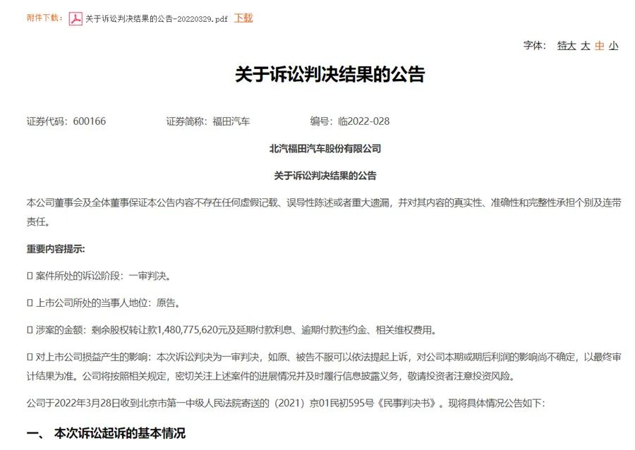 这让福田汽车“蚌埠住了”,开始寻求使用法律手段维护自己的合法权益,几天前,福田发布公告称,3月25日,公司收到了北京仲裁委员会寄送的《关于(2022)京仲案字第0920号仲裁案受理通知》。公告显示,北京仲裁委员会决定受理福田汽车提交的“长盛兴业应向公司支付北京宝沃剩余股权转让款1,480,775,620元及延期付款利息、逾期付款违约金”仲裁申请,