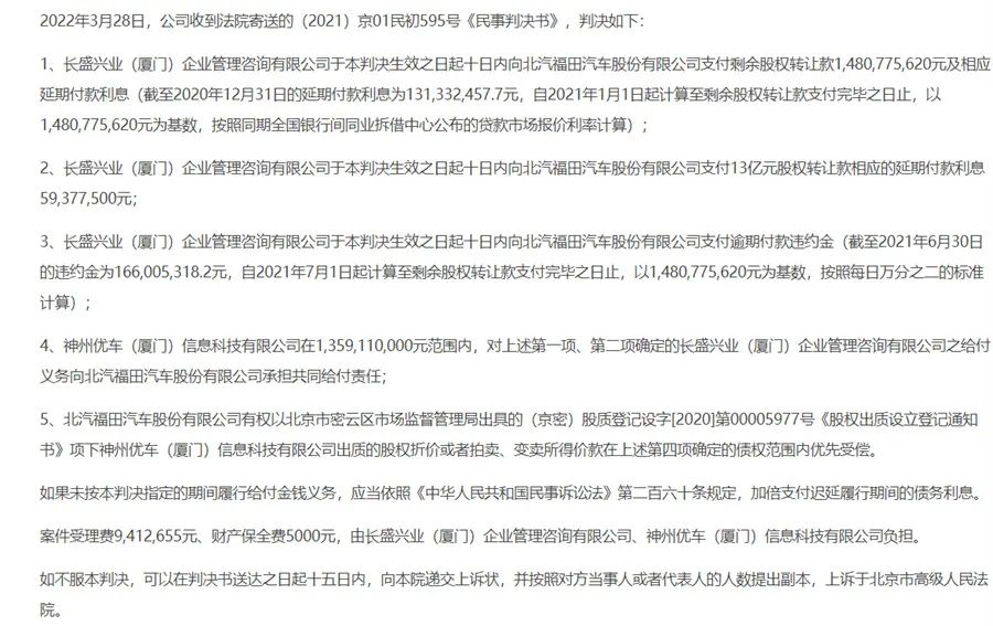 根据福田汽车公告,该公司的诉求,包括长盛公司向公司支付剩余股权转让款1,480,775,620元及相应延期付款利息;长盛公司向公司支付已付的13亿元股权转让款相应的延期付款利息59,377,500元;长盛公司向公司支付逾期付款违约金;神州优车厦门公司在1,359,110,000元范围内,对长盛公司在第一项、第二项诉讼请求中的给付义务承担共同给付责任;在第四项诉讼请求所指神州优车厦门公司的给付责任范围内,公司就神州优车厦门公司出质的北京宝沃汽车股份有限公司(曾用名北京宝沃汽车有限公司,以下简称宝沃公司)26,755.8176万股股份的折价或者拍卖、变卖所得价款优先受偿;本案诉讼费用由长盛公司、神州优车厦门公司承担。