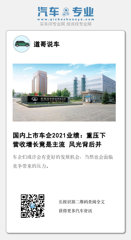 而国内另一大民营车企长城汽车也取得了营收、利润双双增长的成绩,根据长城汽车2021年年报,2021年,长城汽车营收达到1364亿元,同比增长32.04%;归属于上市公司股东的净利润达到67.3亿元,同比增长25.43%。当年,长城汽车全年累计销售新车128.1万辆,同比增长14.79%,同样取得了不小的增长。