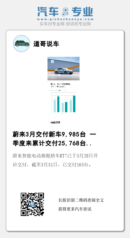 4月1日,蔚来公布2022年3月交付量,共交付智能电动汽车9,985台,同比增长37.6%。2022年一季度,蔚来累计交付智能电动汽车25,768台,同比增长28.5%,连续8个季度正增长。截至2022年3月底,蔚来累计交付192,838台智能电动汽车。