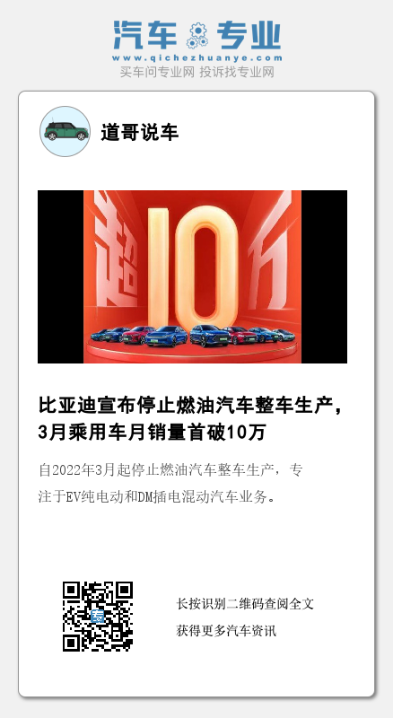 公布销量的同时,比亚迪汽车宣布,根据公司战略发展需要,自2022年3月起停止燃油汽车整车生产,专注于EV纯电动和DM插电混动汽车业务。