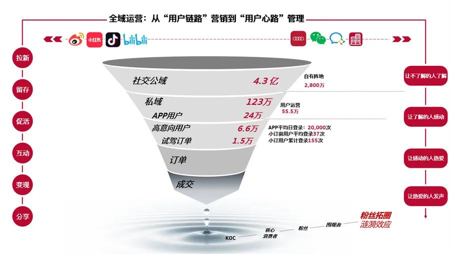 品牌的全域运营是一个庞大的体系工程,用数字化工具将从公域获取的流量,沉淀到私域,通过私域流量运营,形成裂变,实现品牌影响的增值。相较于从公域获取流量,如何保持这些用户在私域中的粘性和活跃度才是上汽奥迪运营工作的重点。上汽奥迪投入了大量的资源和成本,做精细化管理,最大化地拉近品牌与用户的距离,使其获得更完整、更独特的品牌体验。这就是上汽奥迪从“用户链路”营销到“用户心路”的全域管理。