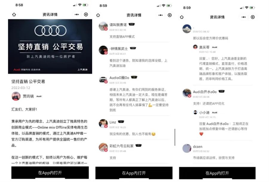 除此之外,上汽奥迪创立了独具特色的创新商业模式——Online mix Offline实体电商生态体验,以品牌直销的模式,通过上汽奥迪APP唯一官方订购渠道,为所有用户提供全国统一售价的产品。让所有用户可以通过一个公平、公正的价格和渠道,将您们的爱车带回家。“支持上汽奥迪的直销模式,让市场变得公开透明”,“市场就应该这样,欣赏与支持。实价销售,踏实服务”……上汽奥迪的APP中,充斥着这样的显示车主支持的评论。