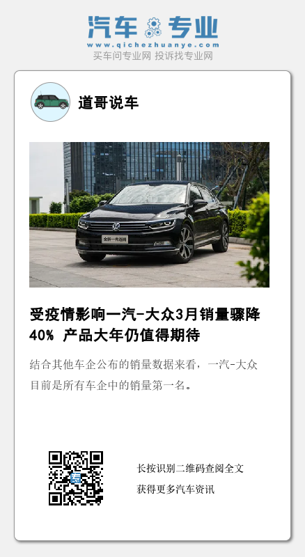 根据相关渠道消息,一汽-大众3月销量126131辆(不包含奥迪进口车),同比下滑40%,其中,大众品牌3月总销量70198辆,在整体销量当中占据着很重要的份额。结合其他车企公布的销量数据来看,一汽-大众目前是所有车企中的销量第一名。大众品牌3月总销量70198辆,在集团销量当中占据着很重要的份额。
