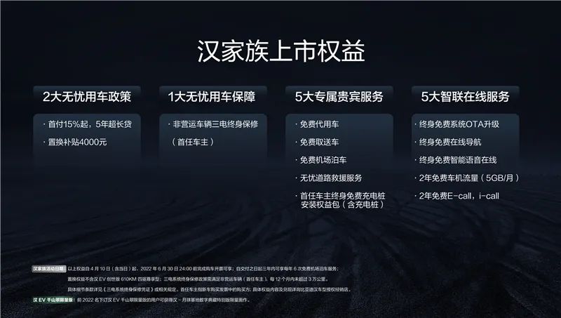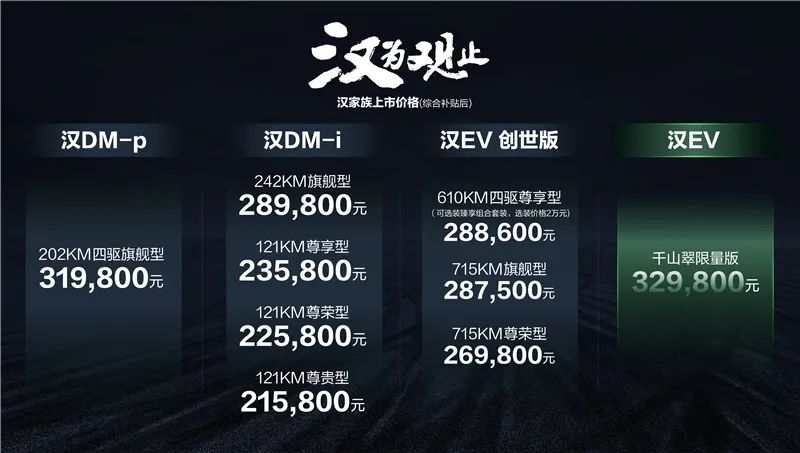 4月10日,产品矩阵全面进化的汉家族正式迎来上市,共推出4款车型包括汉EV创世版、汉DM-i、汉DM-p以及汉EV千山翠限量版,综合补贴后售价区间为21.58-32.98万元,同时,比亚迪还为用户准备了2大无忧购车政策、1大无忧用车保障、5大专属贵宾服务、5大智联在线服务等多重购车礼遇。