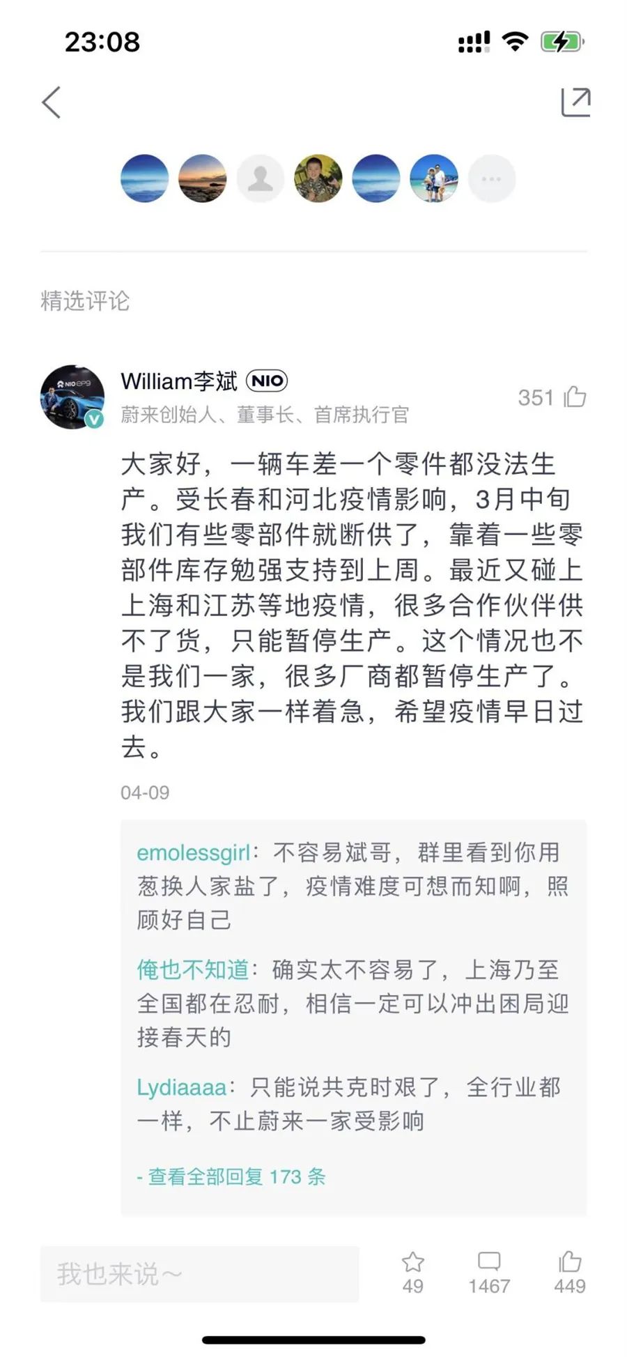 【文/道哥说车 听风吟】“不容易斌哥,群里看到你用葱换人家盐了,疫情难度可想而知啊,照顾好自己”,蔚来APP中,蔚来创始人李斌在蔚来“暂停生产”的消息下说明了停产状况,而这一则评论则是蔚来APP用户对李斌所说。