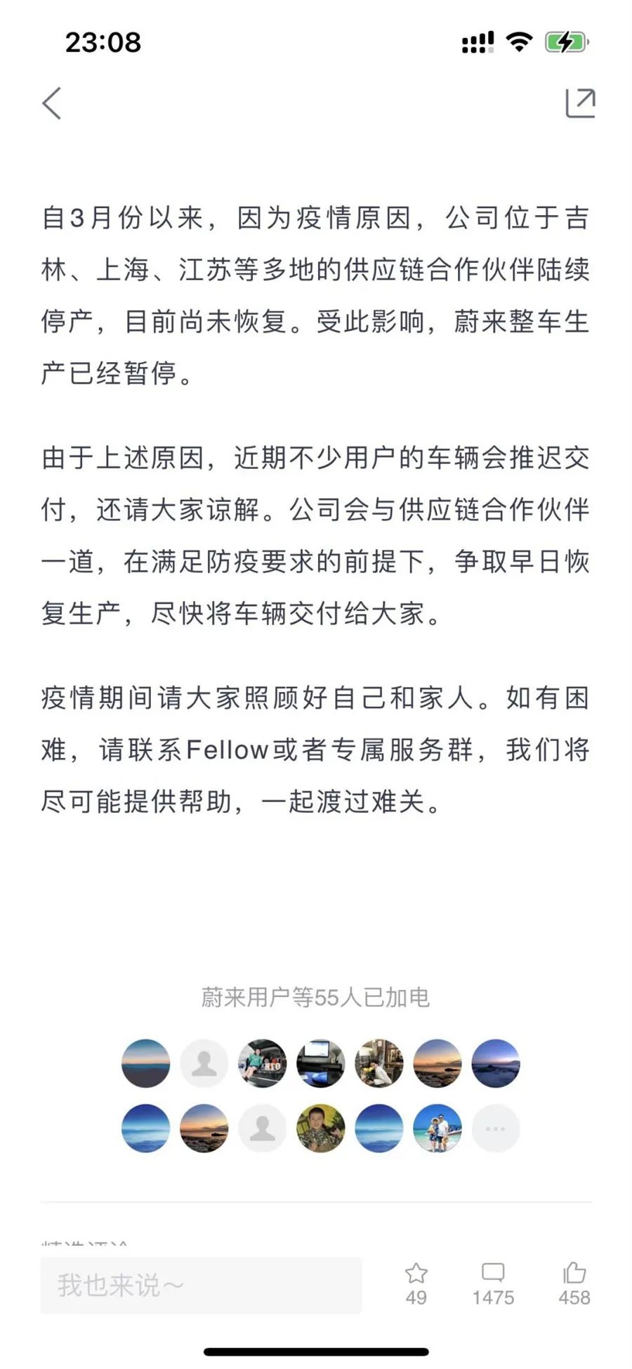 “自3月份以来,因为疫情原因,公司位于吉林、上海、江苏等多地的供应链合作伙伴陆续停产,目前尚未恢复。受此影响,蔚来整车生产已经暂停”,4月9日,没有任何预兆的停产消息出现在蔚来APP上,尽管是焦点图,但还是让人感觉这更像是一个小道消息。