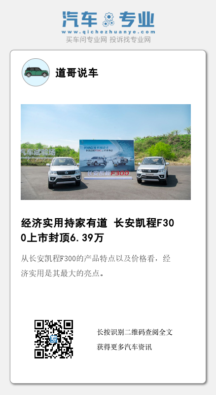 总的来看,长安凯程F300的外观设计以及内饰配置以简洁规整为主,无法如很多乘用车以及高端皮卡一般做到凌厉、运动外观与科技、豪华内饰配置一应俱全。但对于长安凯程F300这样一款定位亲民的工具型皮卡来说,简洁、实在更能获得受众群体的喜爱,毕竟这意味着更少的支付成本。