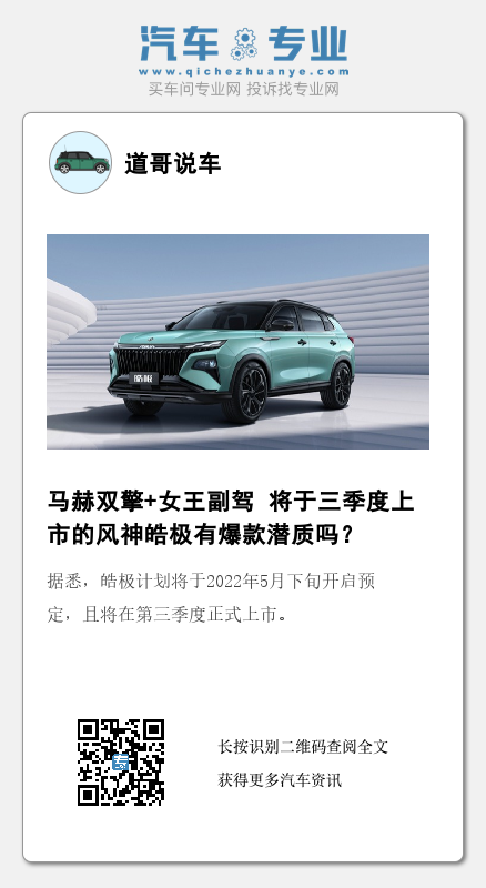 综合来看,无论是超高的颜值、宽敞的空间、领先的智能科技,还是燃油/混动的双动力选择,东风风神皓极都是一款非常值得期待的新车。而“皓极以一款中级SUV的产品标准打入紧凑级市场”官方宣言,也预示着皓极是一款主打性价比的车型,相信,其未来上市时在售价上还会给我们带来更多惊喜!