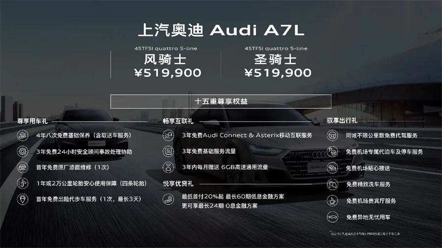 此次品牌盛典上,除了备受关注的奥迪Q6被披露更多消息外,奥迪A7L系列也再增添了新力量,奥迪A7L圣骑士版、风骑士版上市,两款特别版车型售价51.99万元,包含4种配色,在45TFSI十五项标配装备的基础上,叠加了quattro智能四驱、智能离车泊车、B&O 3D环绕音响、20吋轮毂、3D全景影像、前排座椅加热等高阶配置。