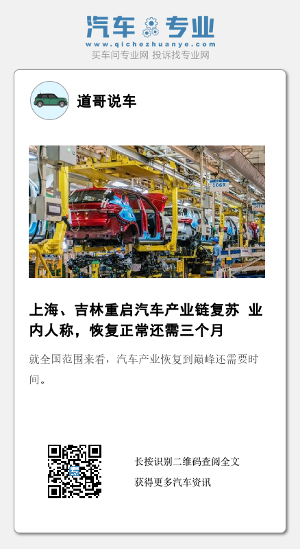 【文/道哥说车 听风吟】北方,吉林疫情得到有效控制,作为“新中国汽车工业摇篮”的一汽集团复工复产,长春这个北方的汽车之城,也逐渐复苏,包括整车生产、汽车零部件生产都渐渐重启;南方,随着上海方面出台《上海市工业企业复工复产疫情防控指引(第一版)》,并建立了重点企业“白名单”制度,包括汽车产业在内的众多产业复工复产,包括上汽集团、特斯拉以及众多零部件企业,开始了复产的推进工作。