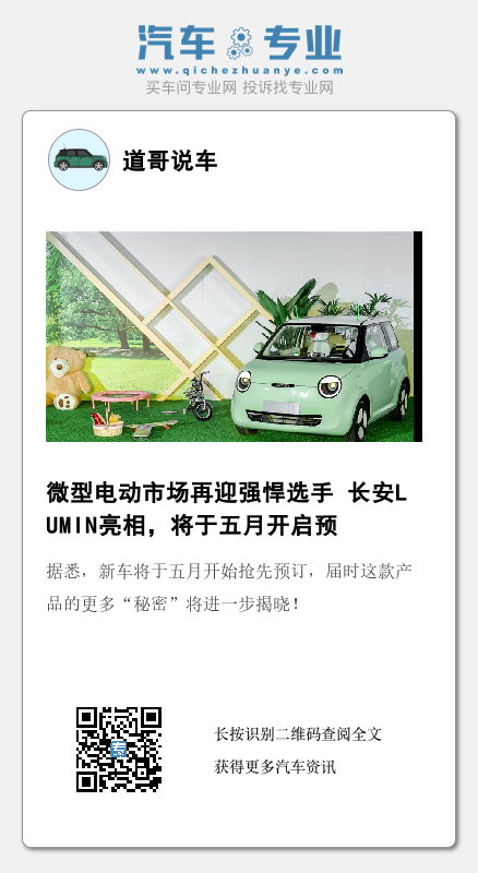从长安LUMIN所展现的实力来看,无论是宽体设计带来的舒适空间、领先的智能科技、丰富的配置以及全方位的安全防护,在如今的A00级市场中都有着不错竞争力,也为消费者带来了全新的纯电出行体验。据悉,新车将于五月开始抢先预订,届时这款产品的更多“秘密”将进一步揭晓!