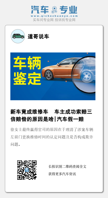二审中,法院驳回上诉,维持原判,至此,这件假一赔三案宣告结束。在徐女士的这起案件中,可以发现,她最终赢得官司的原因在于理清了涉案车辆左前门更换维修时间的认定问题及是否构成欺诈问题。一份第三方检测报告、涉案车辆维修情况需要专业仪器才能鉴定,小瑕疵与整体维修更换之间的差异,这些都成为徐女士一审二审中胜诉的重要支撑点。
