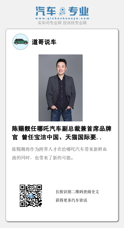 5月5日,《道哥说车》自官方获悉,哪吒汽车任命陈赐靓为哪吒汽车副总裁兼首席品牌官,全面主导负责哪吒汽车品牌建设及运营、公关传播、产品规划等业务板块,向哪吒汽车联合创始人、CEO张勇汇报。