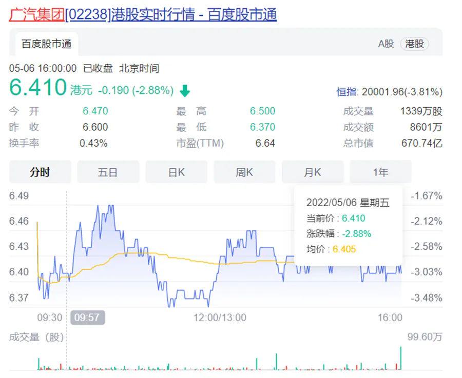 上汽集团、广汽集团纷纷以控股股东增持的方式展开护盘行动并非没有原因,实在是两家公司的股价有些不太景气。5月6日收盘,上汽集团股价报收16.34元,市值仅1909亿,值得一提的是,今年以来上汽集团股价已经跌约20%。而广汽集团的境况也好不到哪里去,5月6日收盘,广汽集团港股股价跌2.88%,报收6.140港元,总市值约670.74亿,A股股价当日虽稍有上涨,但也仅仅以12.29元/股收盘,市值1286亿。